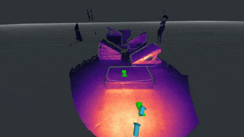 This animation is a 3D visualization that shows what the robot is seeing and planning as it navigates the parkour obstacle course. Actively tracked objects are drawn in green and fade from green to purple as they go out of view of the robot’s perception sensors. The tracking system continuously estimates the poses of objects in the world and the navigation system plans the green footsteps relative to those objects using information from the map.